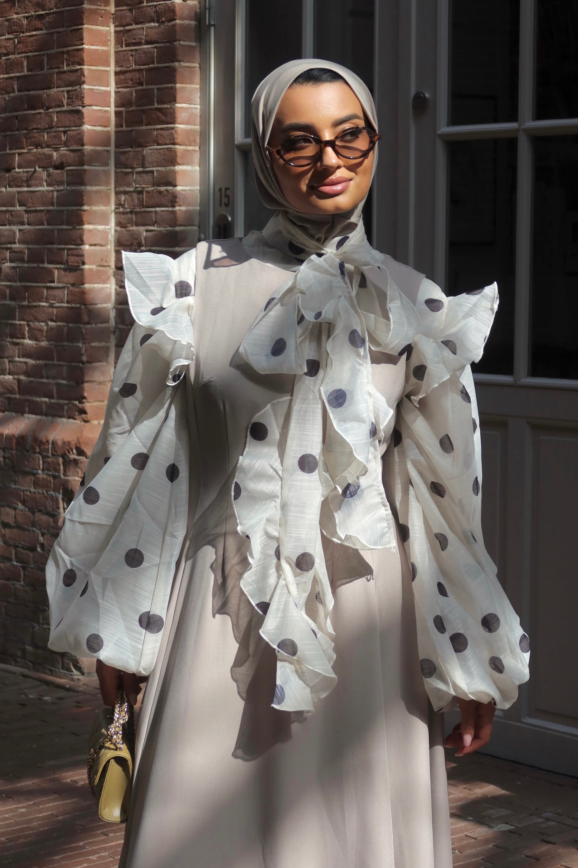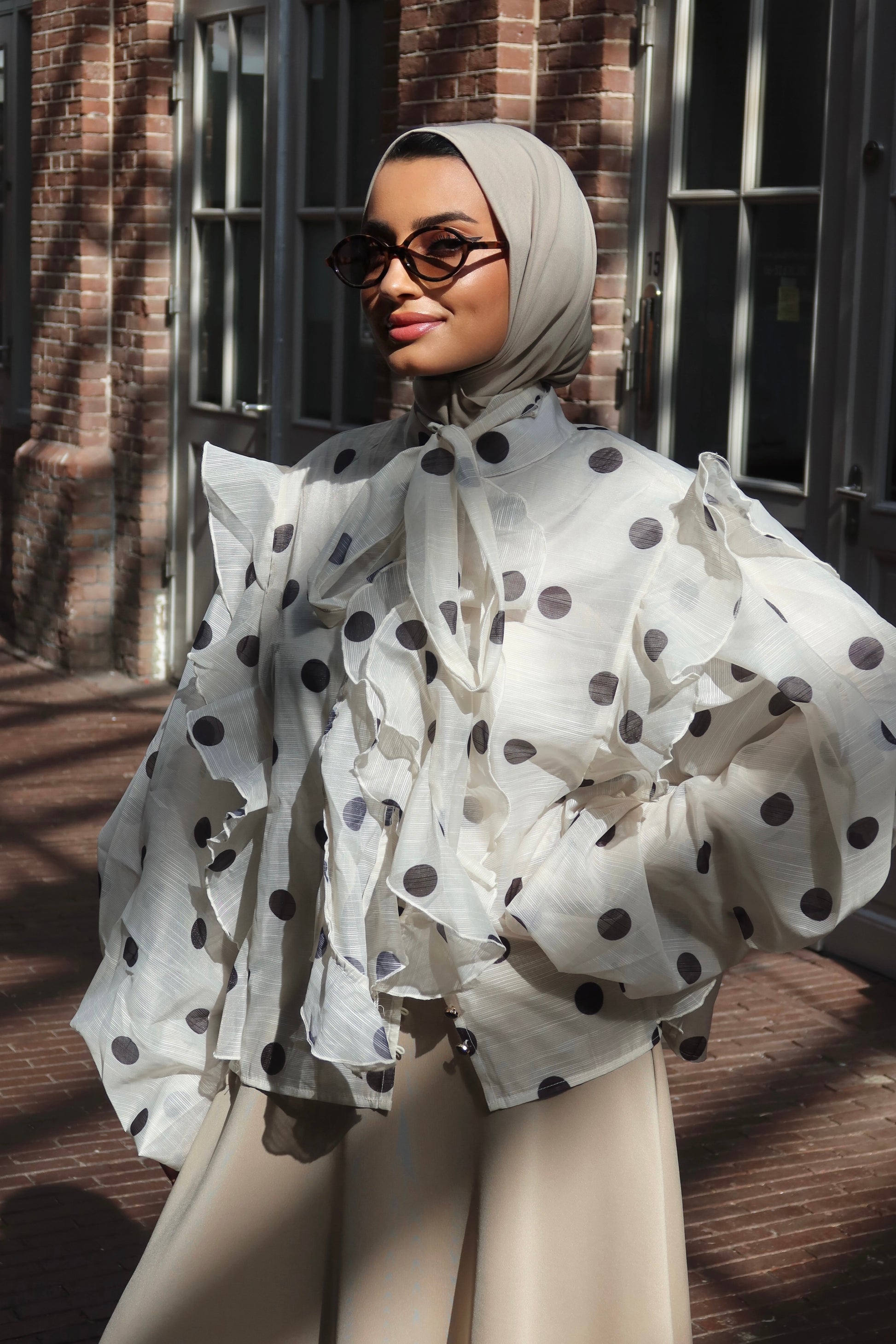 This elegant blouse is a true eye-catcher. Crafted from a lightweight, semi-sheer fabric with a classic polka dot print. The voluminous ruffles and balloon sleeves create a bold silhouette with a feminine twist. A delicate bow tie at the neckline adds a touch of romantic flair, while the neutral tones keep the look refined and timeless.