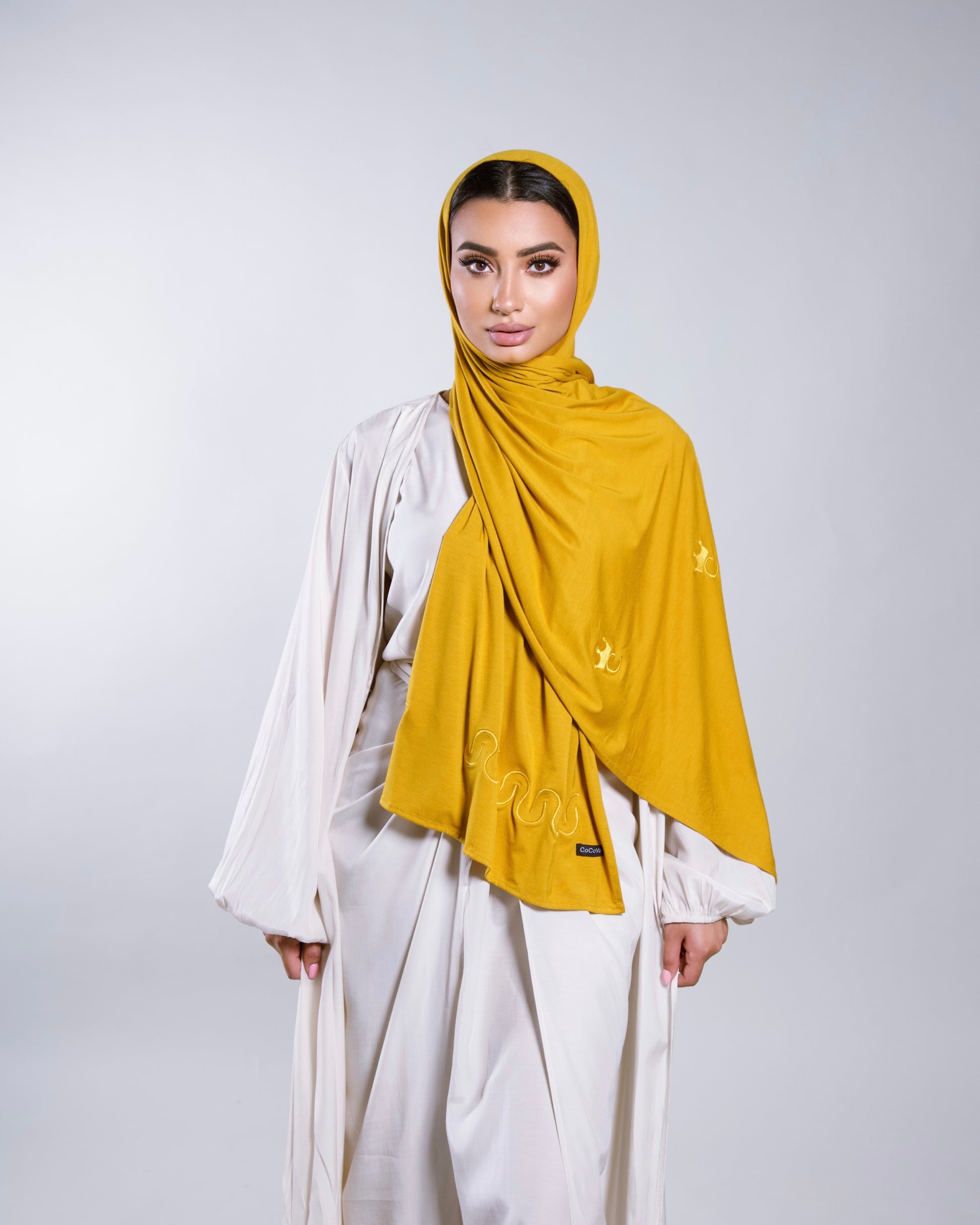 Perfect for your every day, our Bamboo lightweight scarf are effortlessly chic, soft and comfortable. Both sides of the scarf is matte. The stretchy medium weight of bamboo allows infinite styling possibilities while providing full coverage. Perfect for both turbans and hijab styling. The scarf has beautiful embroidery and waves of letter C (Cocova).