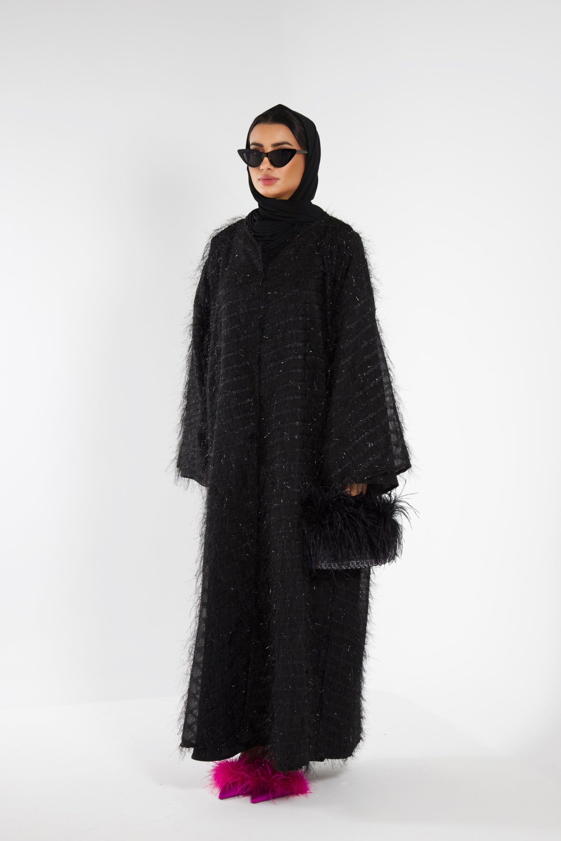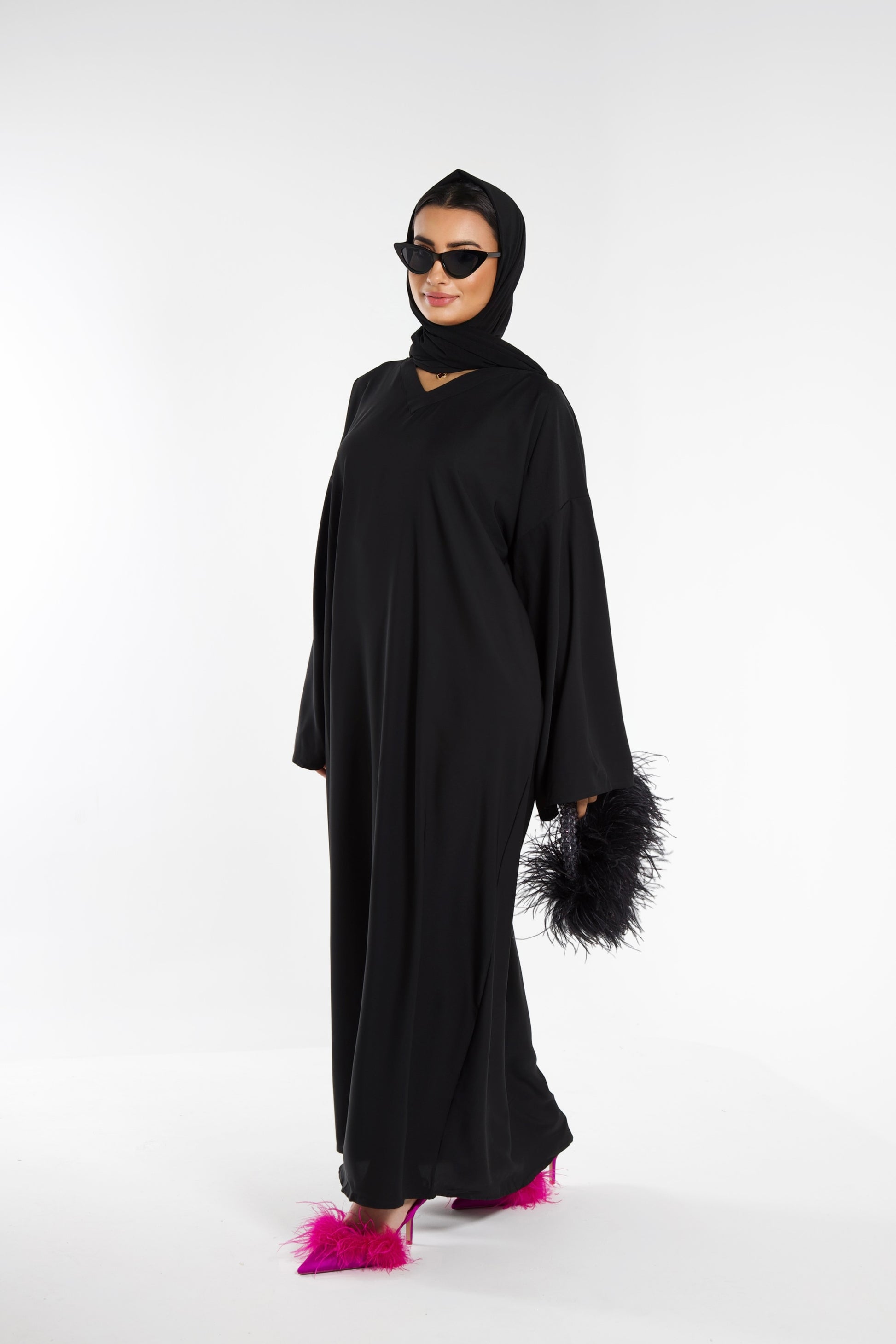 Introducing our Doha Abaya, a distinct and versatile choice for your wardrobe. With its bell sleeves, v- neckline, fluffy fabric, this abaya exudes sophistication. This abaya has transparent push buttons to close.