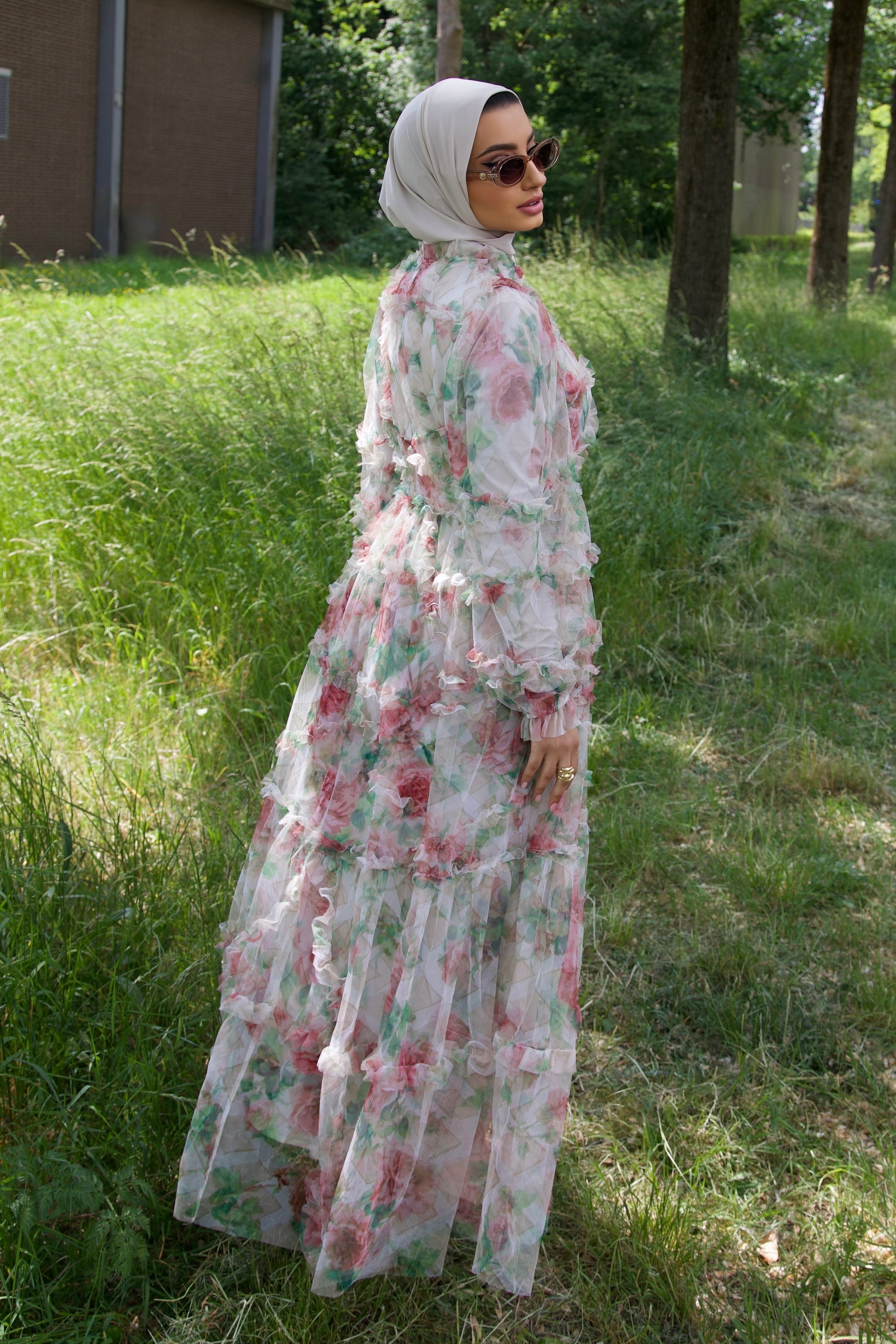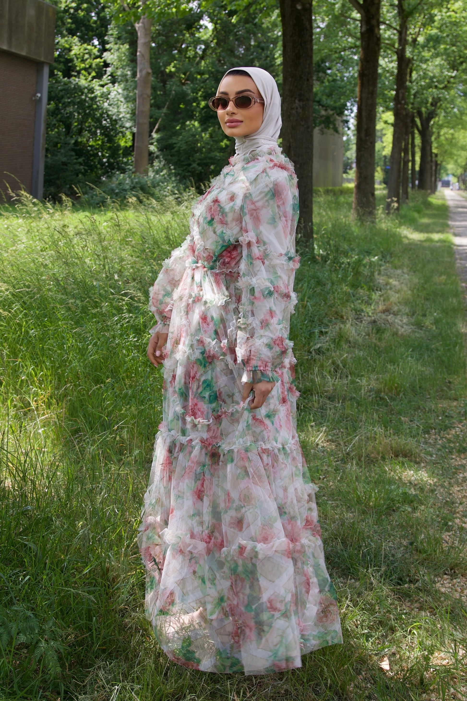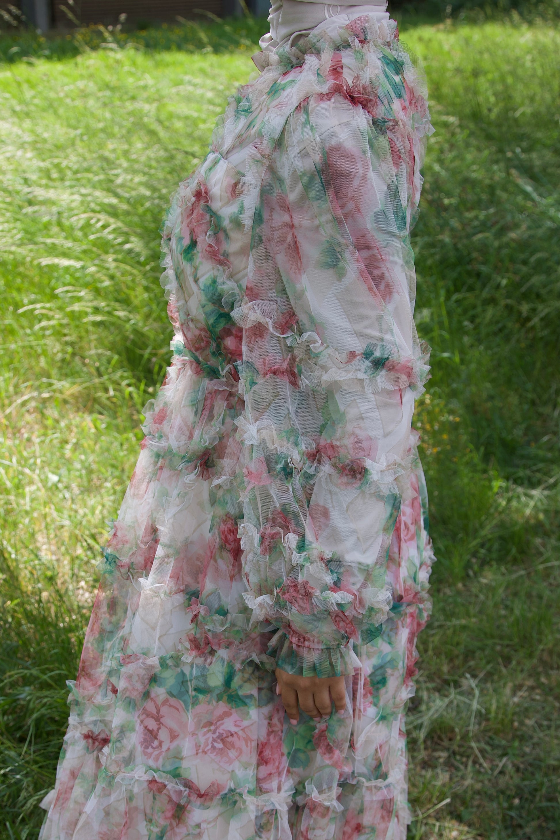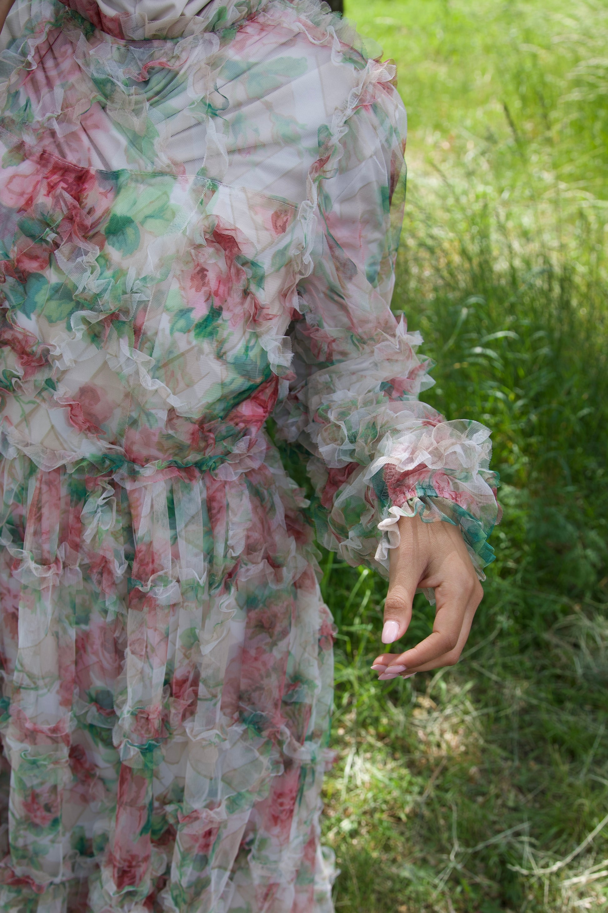 Elevate Your dreamy Rusches Dress with flower print, Indulge in timeless allure with our meticulously crafted dress, perfect for a vintage-romantic themed wedding.