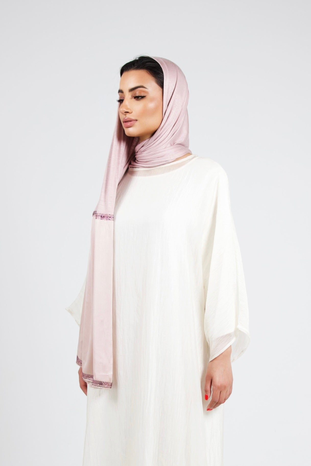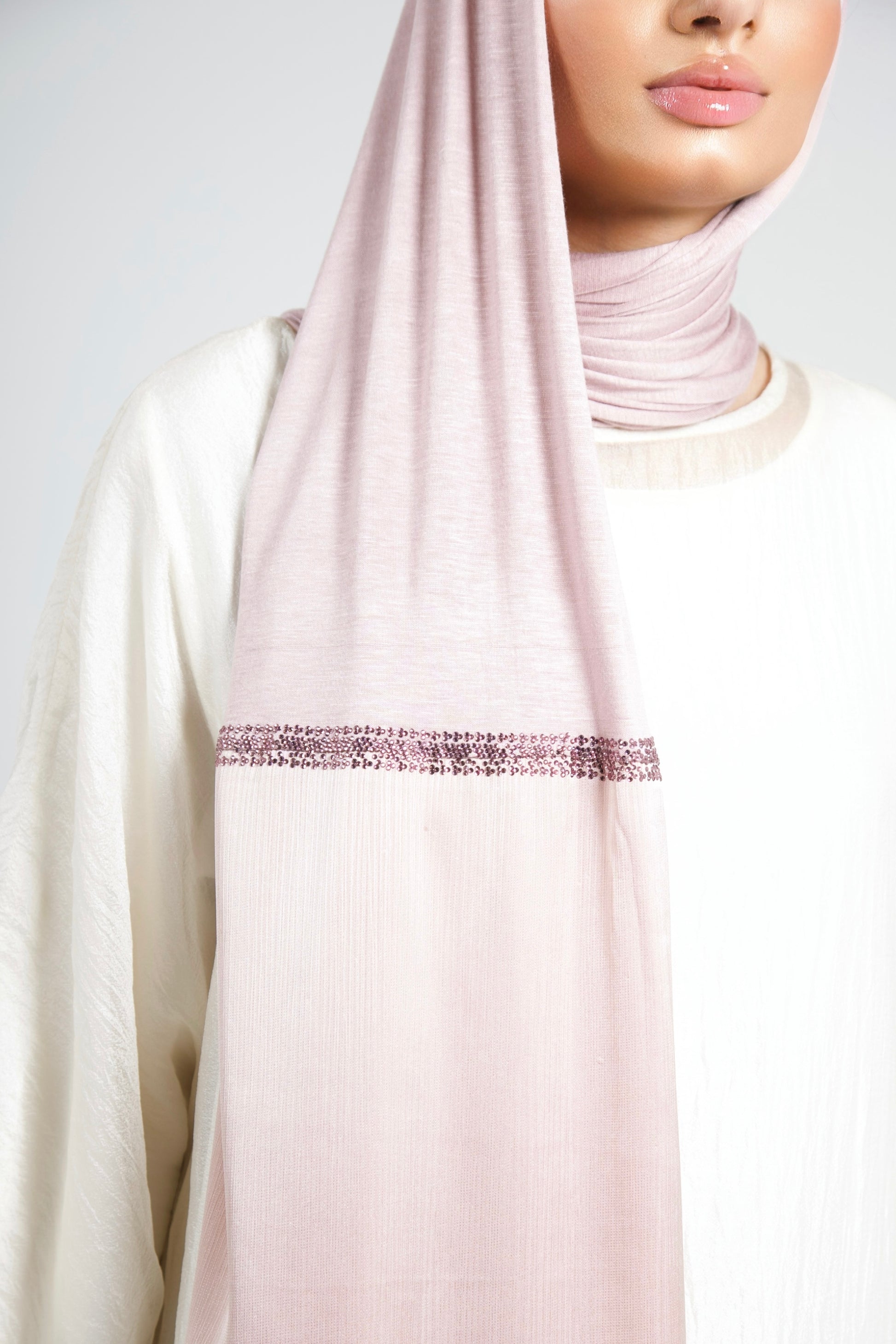 Our Dubai jersey satin scarves are effortlessly chic, soft and comfortable. One side of the scarf is with satin & lilac stones. The stretchy medium weight of jersey allows infinite styling possibilities while providing full coverage.