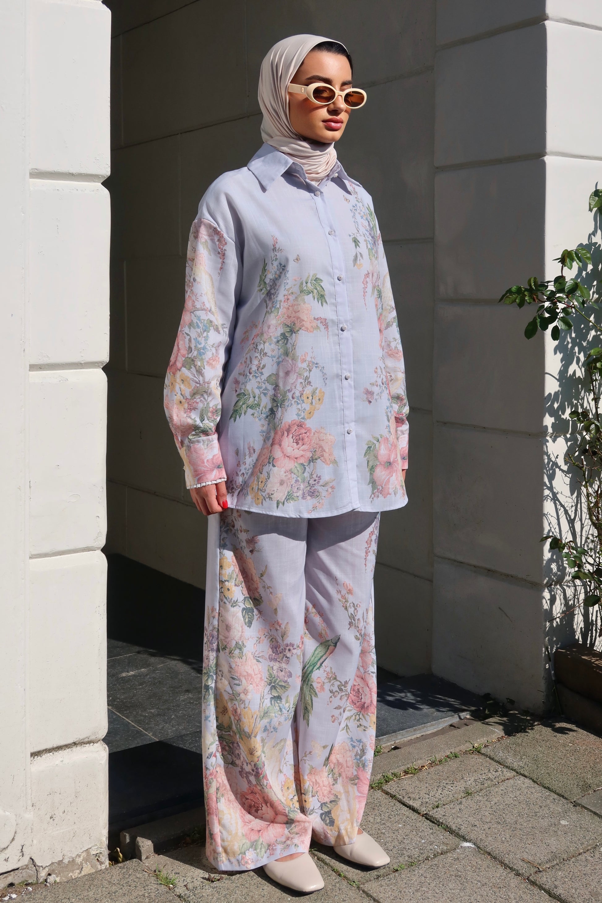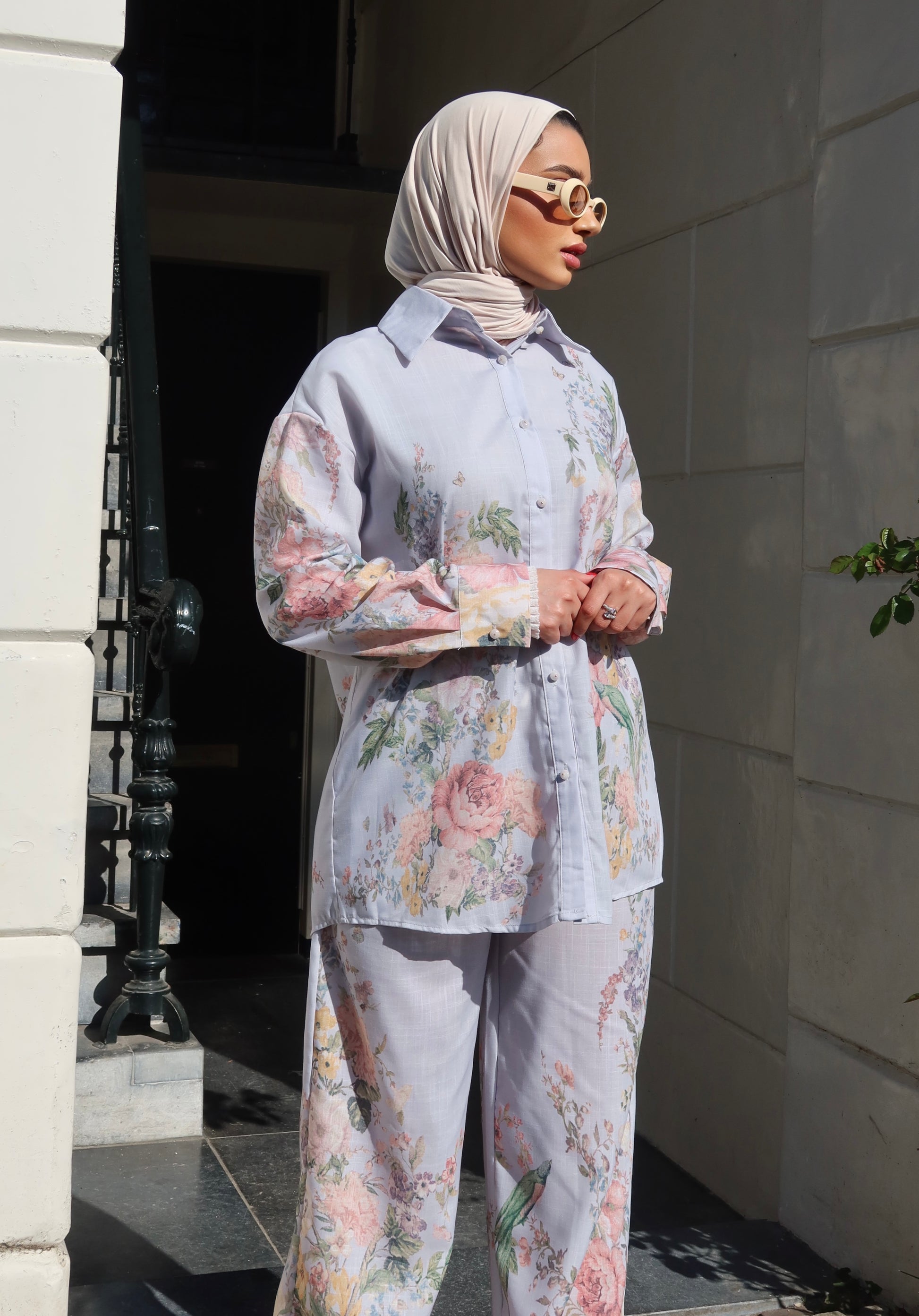 Embrace the floral set with charming pearl buttons. Designed with a romantic fabric , this set features a delicate floral pattern.