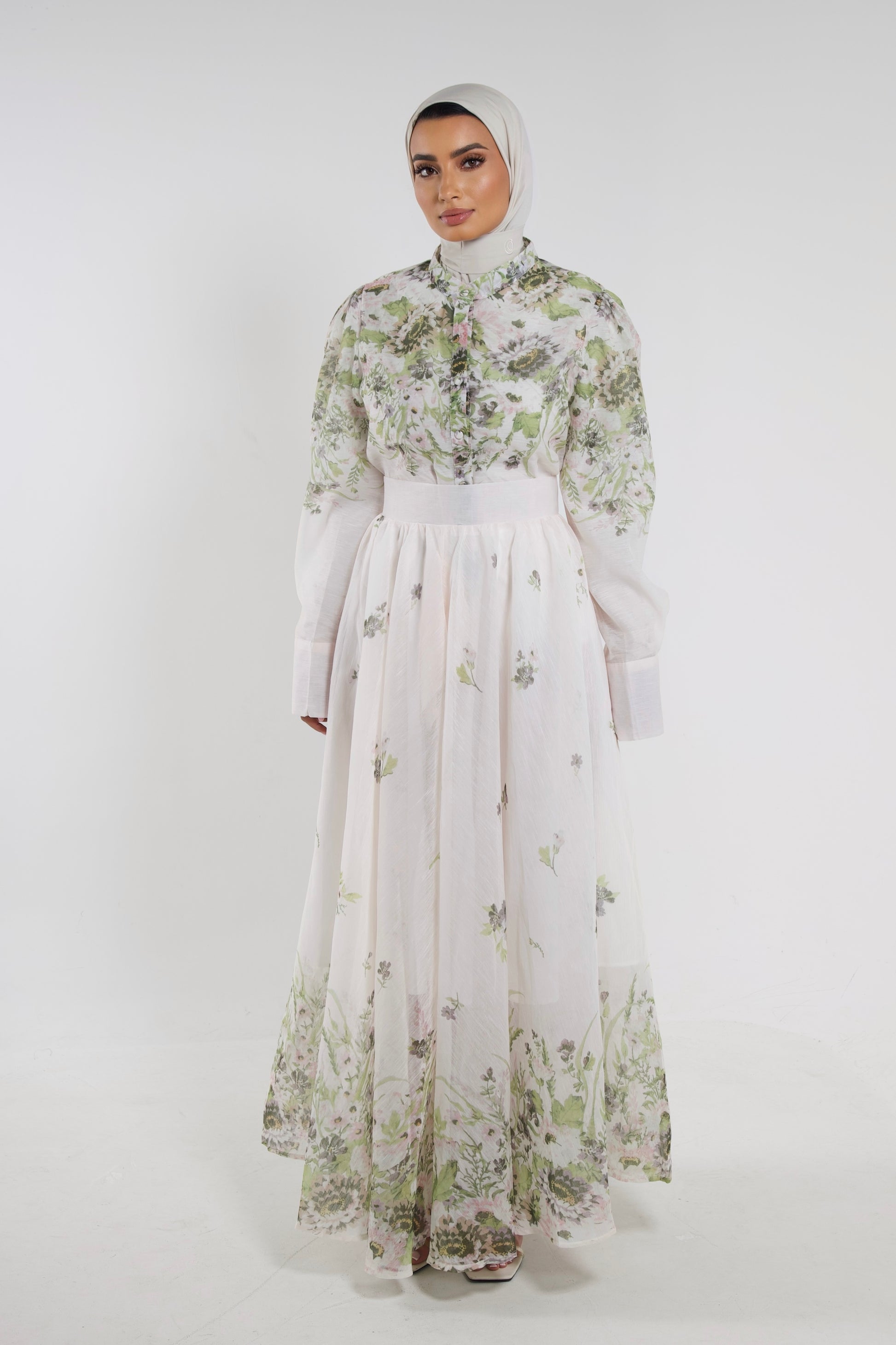 Embrace the floral set with charming pearl buttons. Designed with a romantic fabric , this set features a delicate floral pattern, adding a touch of femininity to its flowing silhouette. The skirt lining ensures comfort and modesty, while the adjustable blouse cinches the waist, creating a flattering and structured look. With its full-length design and long sleeves, this set is perfect for weddings, garden parties, and formal occasions. Skirt is included zip and elastic waist band + underlay. Blouse is included top without sleeves.