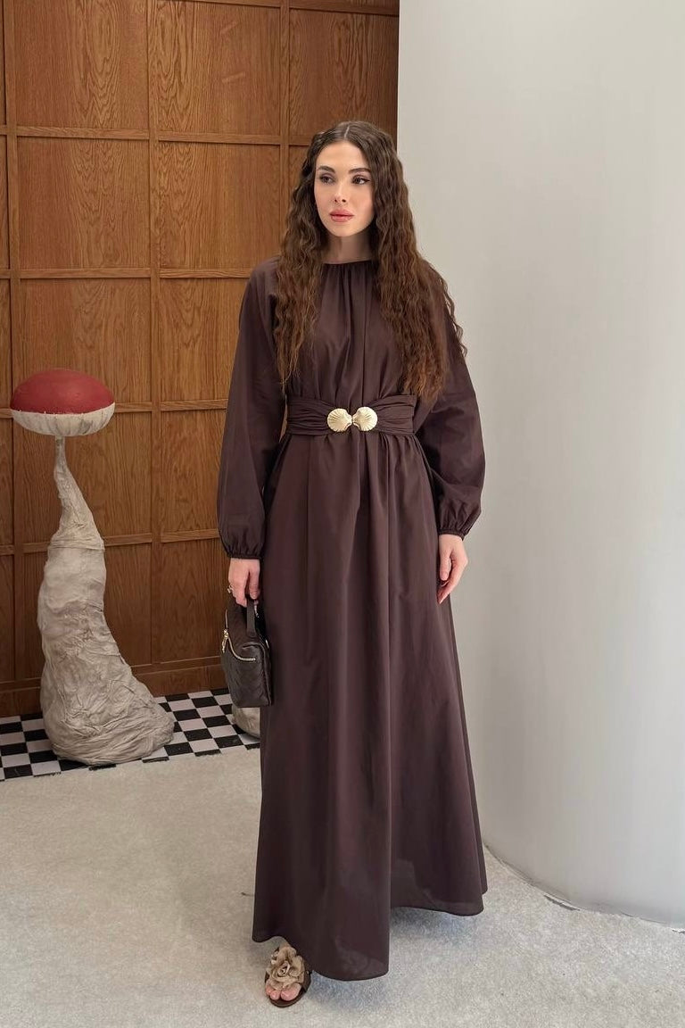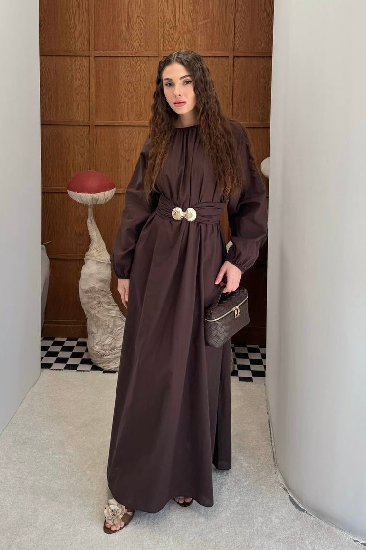 A timeless, full-length dress crafted from a lightweight cotton blend, the Maris Shell Dress is defined by its flowing silhouette and signature shell-inspired belt. Featuring gathered detailing at the neckline and voluminous sleeves, the design brings comfort and sophistication into perfect balance.