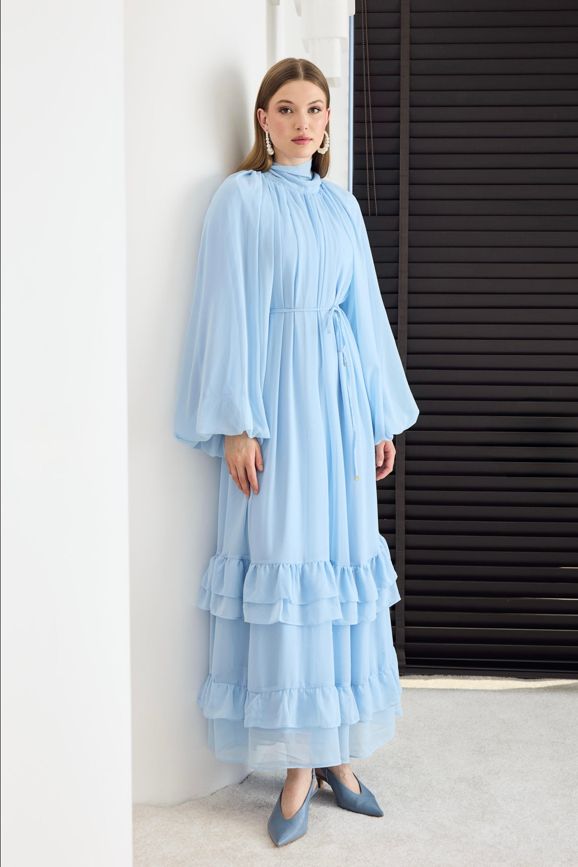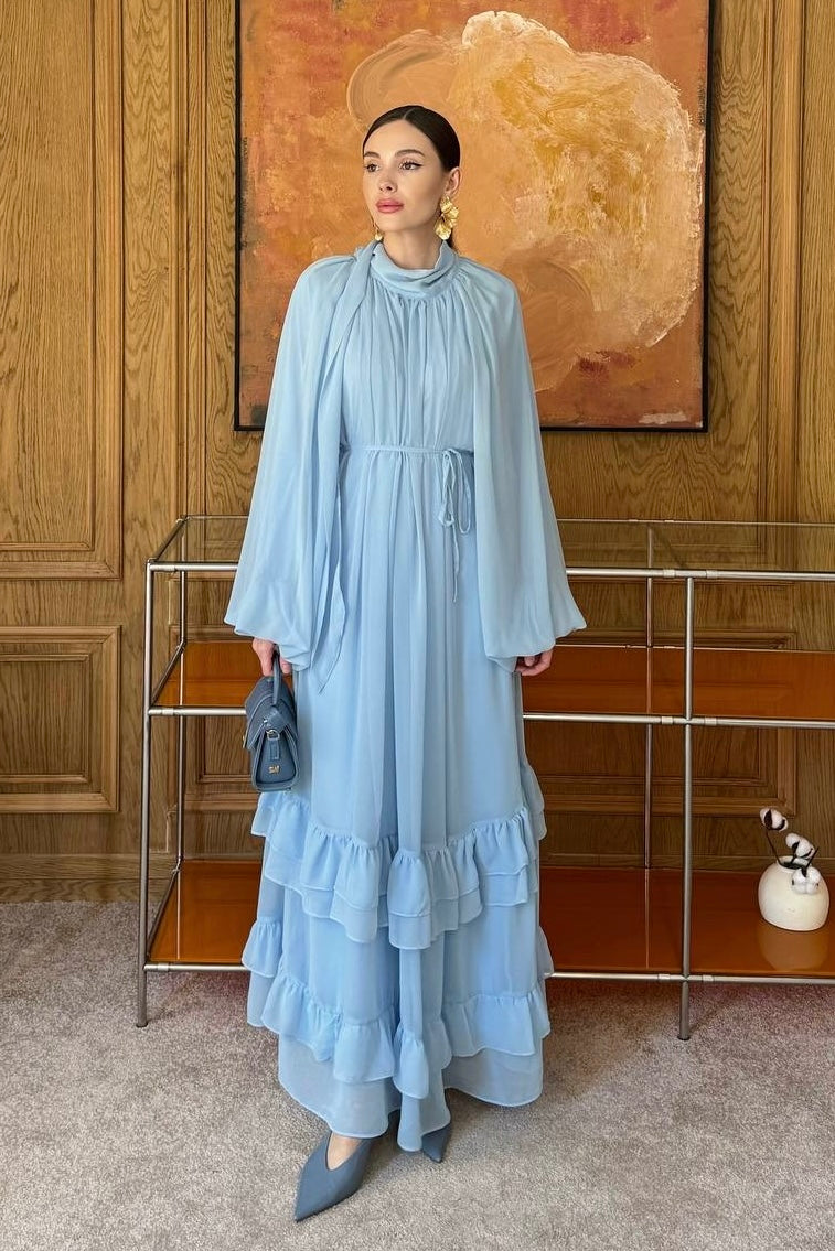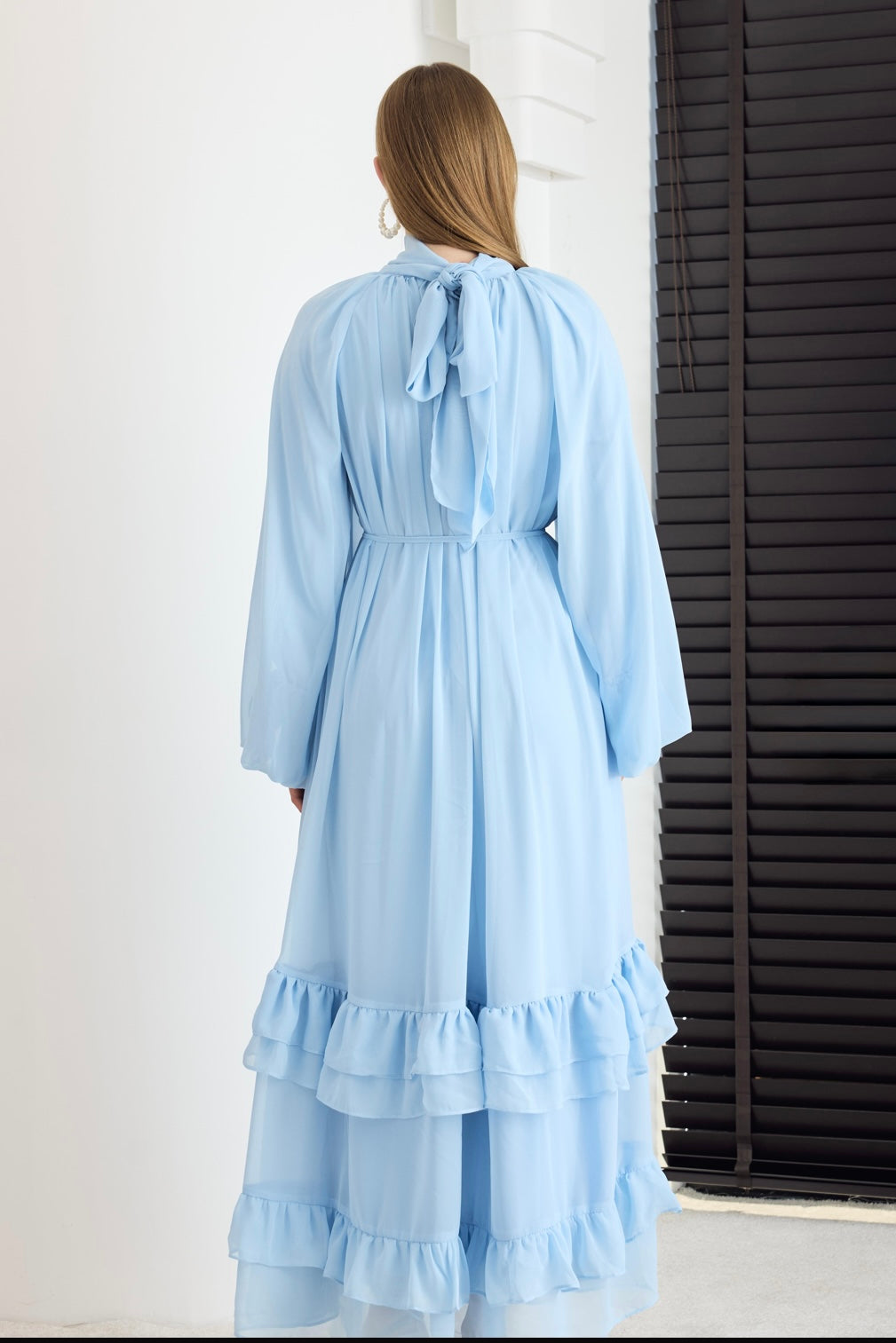 Step into timeless elegance with this flowing chiffon maxi dress, measuring 1.40 m in length. Designed to drape gracefully to the ankles, the silhouette is enhanced by delicate ruffle details for a romantic and refined look.