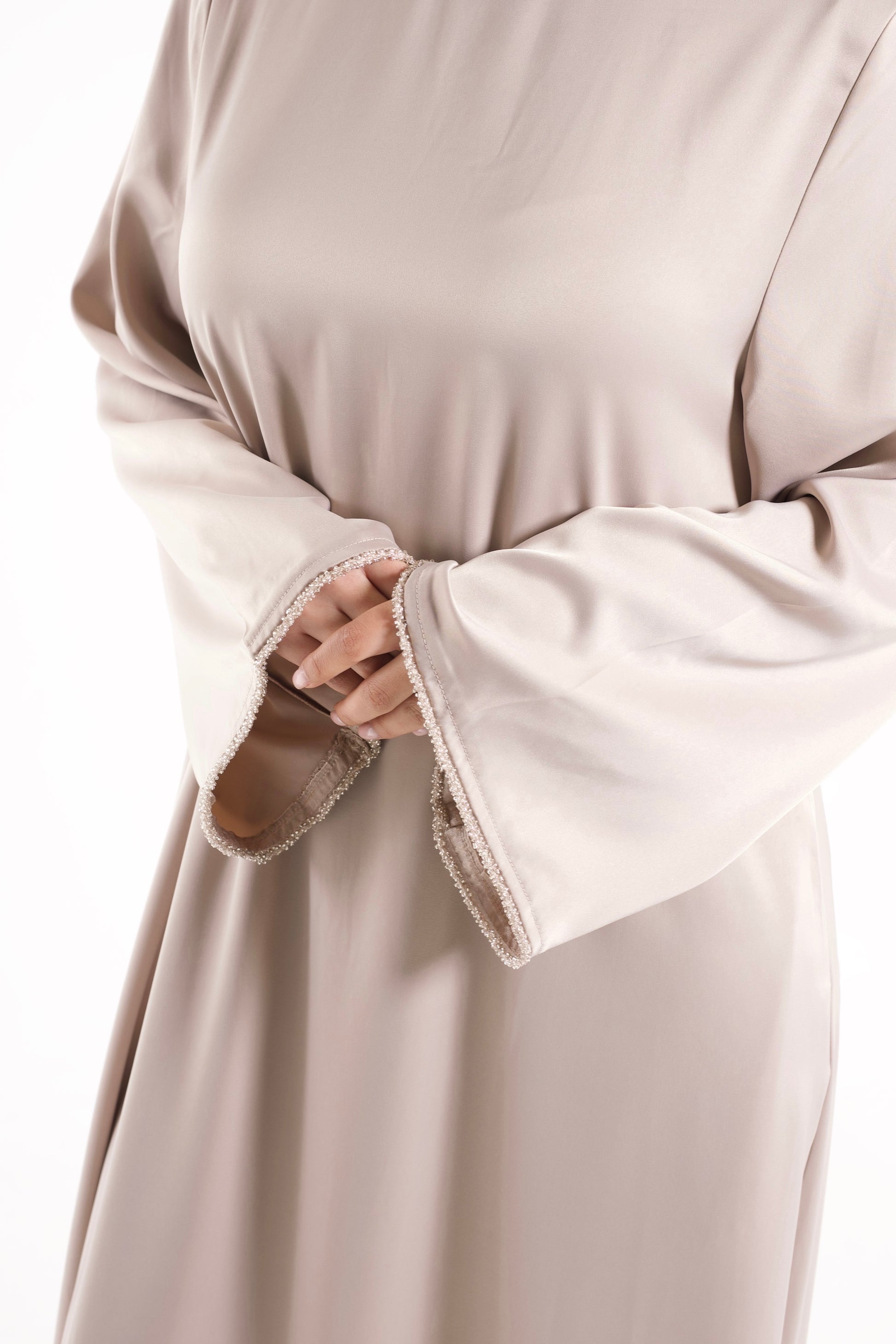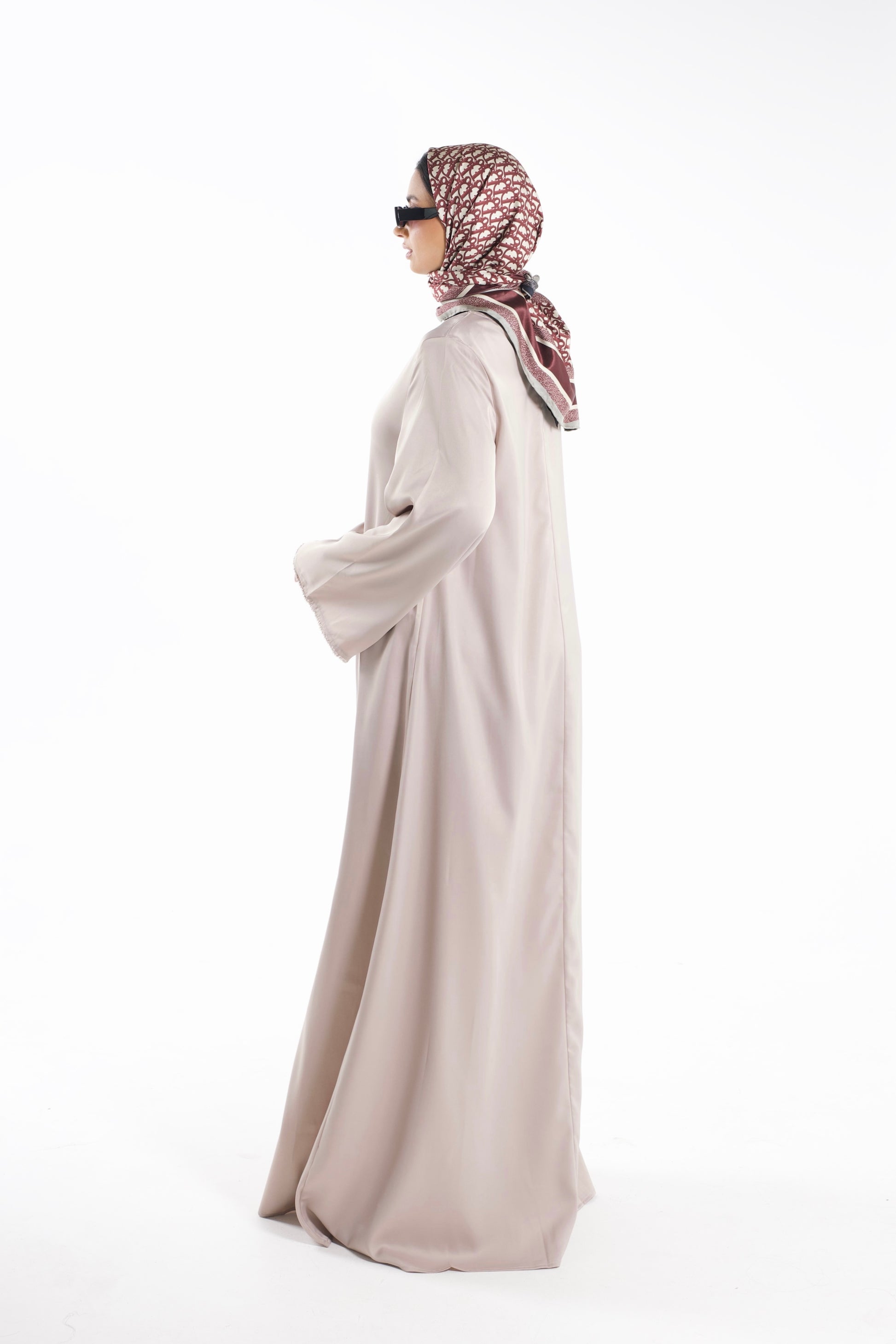 Discover the refined charm of the Silk Abaya, a celebration of simplicity and grace. This Abaya is a dream in soft, flowing fabric, designed to move beautifully with every Step. It comes with beaded details on the sleeves & inner pockets.