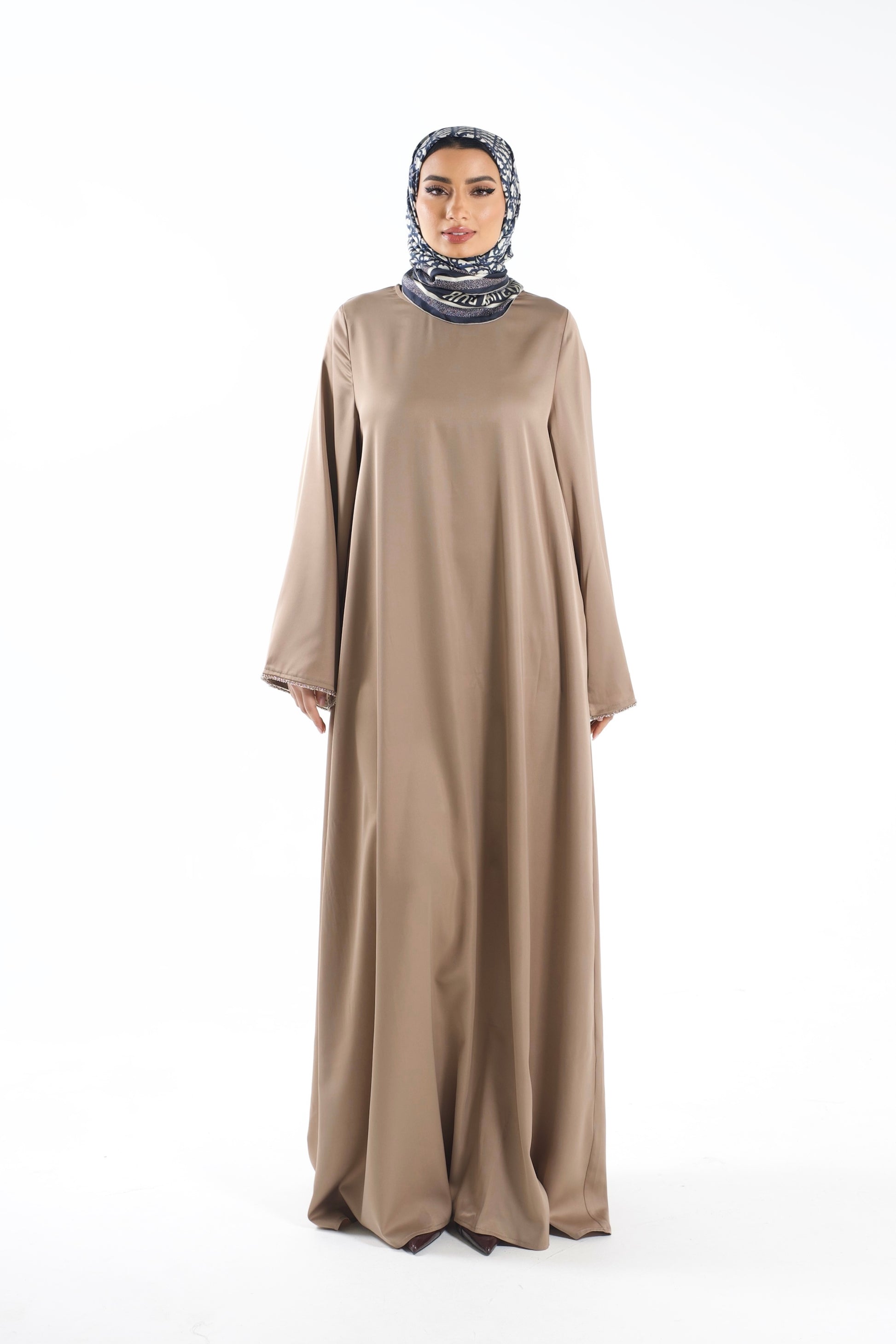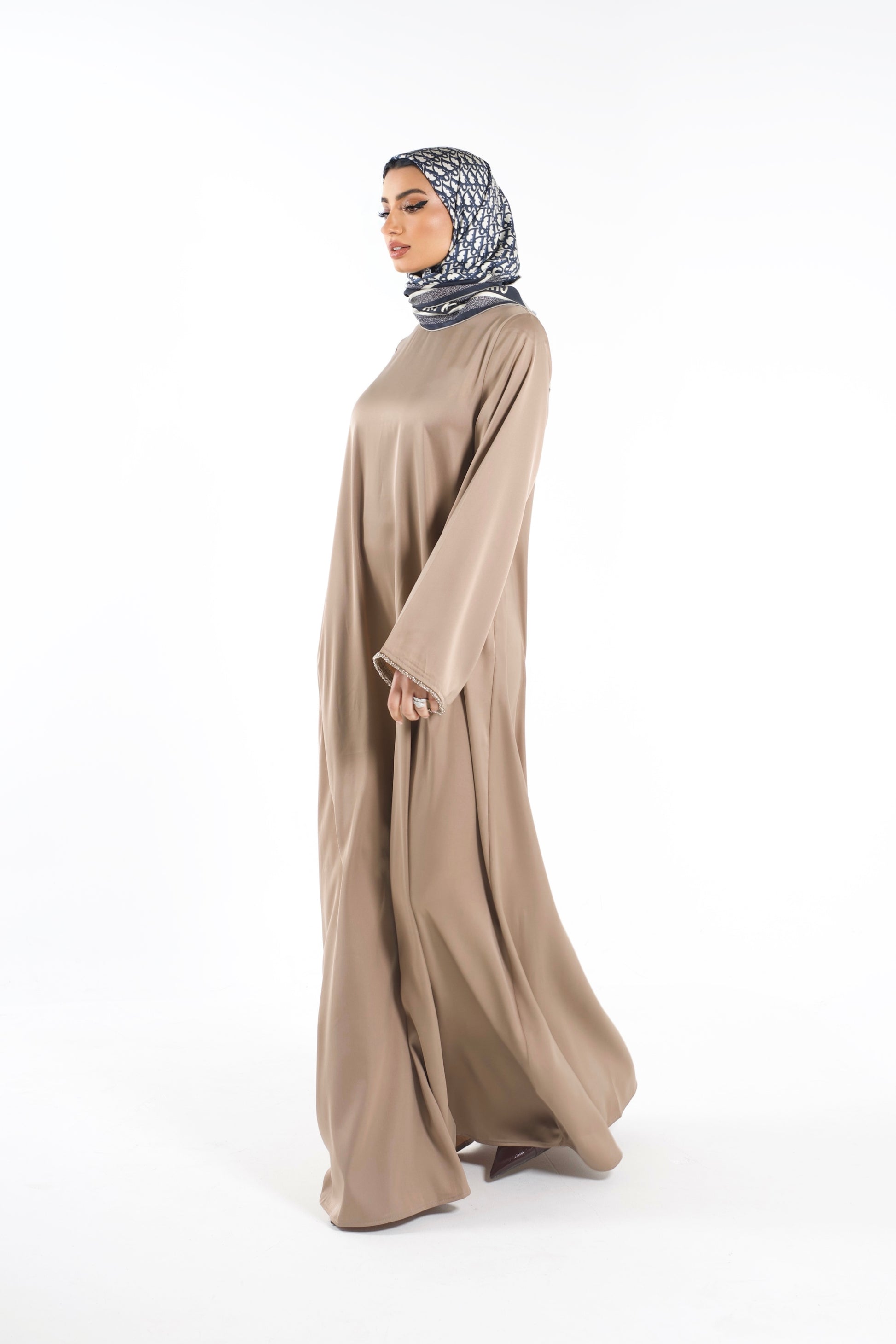 Discover the refined charm of the Silk Abaya, a celebration of simplicity and grace. This mocca pleated silk dress is a dream in soft, flowing fabric, designed to move beautifully with every Step. It comes with beaded details on the sleeves & inner pockets.